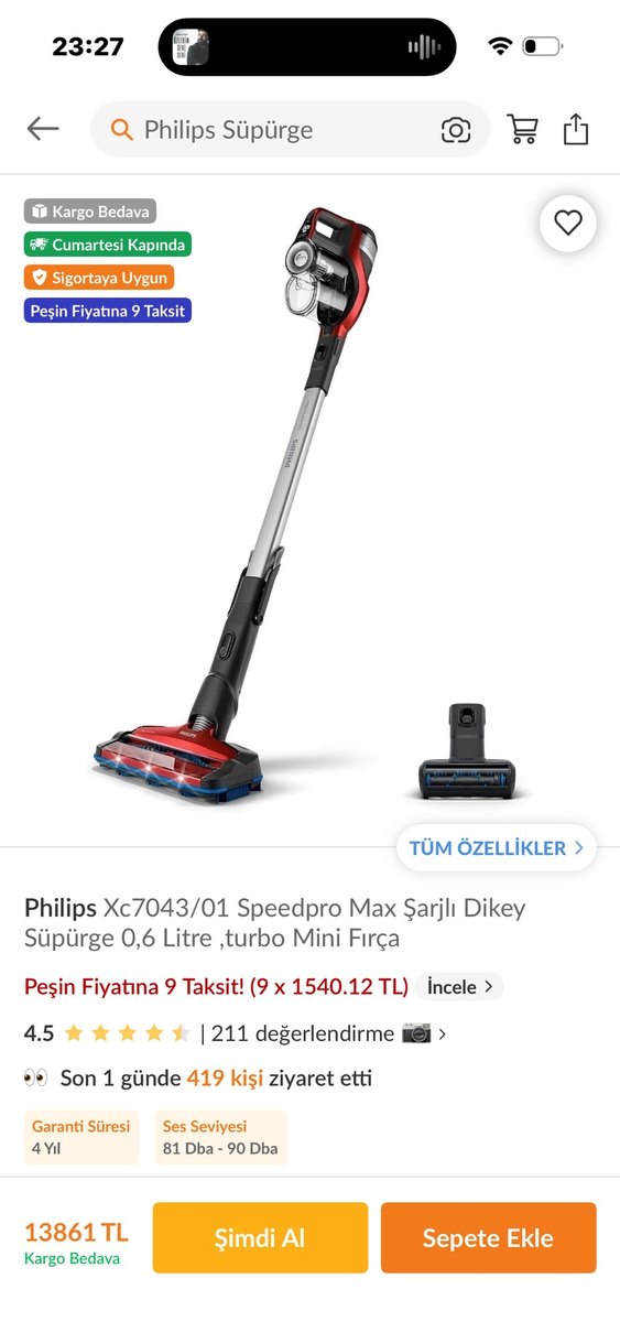 Philips Xc7043/01 Speedpro Max şarjlı dikey süpürge, 0,6 litre toz haznesi ve turbo mini fırça ile donatılmıştır. Koyu kırmızı renktedir. 9 taksit seçeneği sunar.