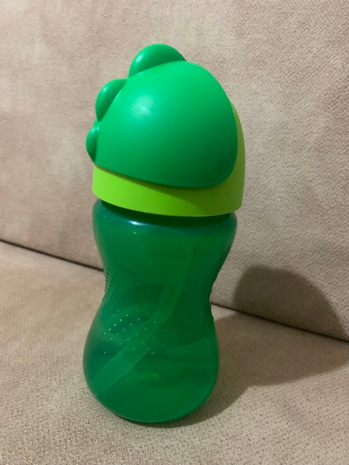 Renkli yeşil bebek biberonu, kolay tutuş için şekilli ve benzersiz kapak tasarımına sahiptir.