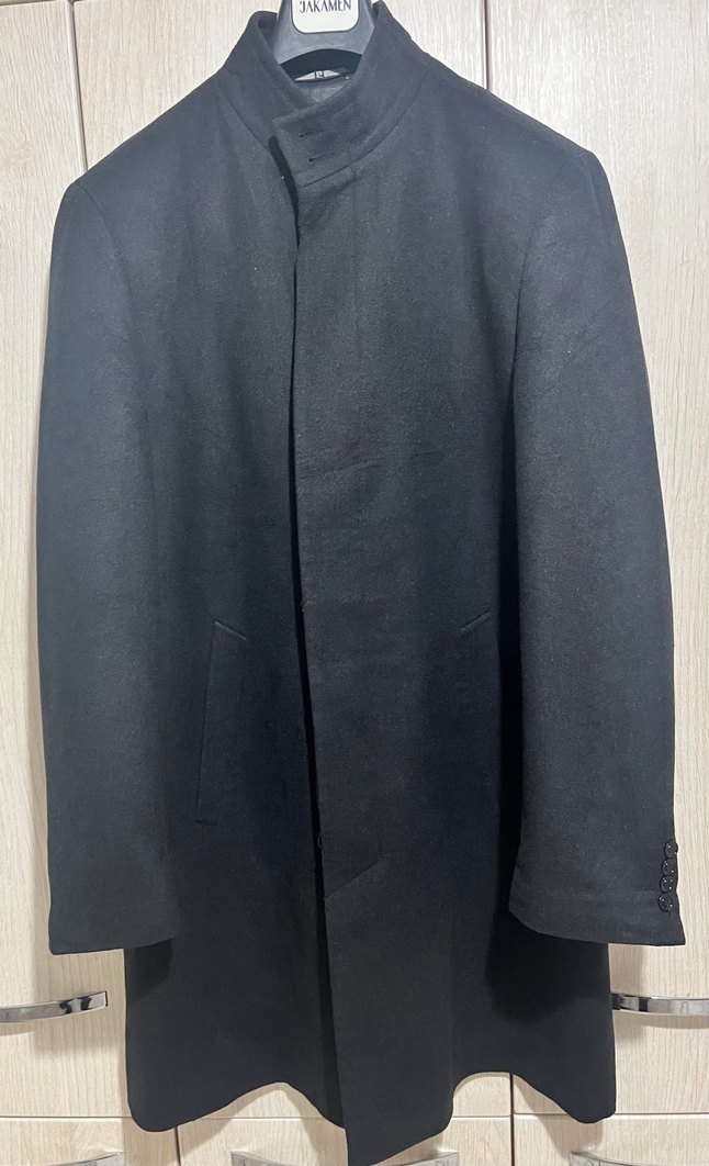 Pier cardin Erkek Siyah kaban düğmeli kapama ile. Uzun kollu, normal kesim, ofis ve günlük şehir stili için uygundur.