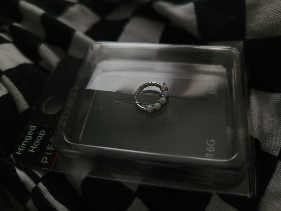 Opal taşlı piercing, küpe. Sıfır, paketli. Çelik.