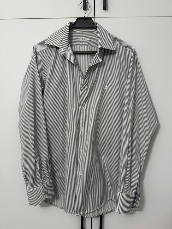 Gri çizgili, uzun kollu erkek gömlek, regular fit ve düğmeli. Ofis ve günlük sokak tarzına uygun, sentetik kumaştan üretilmiştir.