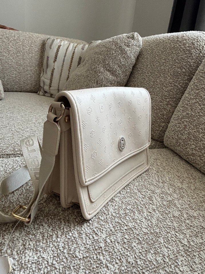 Beyaz deri kadın çantası, baskılı deseni ve tokalı askısıyla modern klasik tarzda, günlük kullanıma uygun Paris esintili şık bir modeldir. Çanta yeni etiketli hiç kullanılmadı bej rengi
