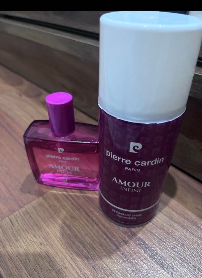 Pierre Cardin Amour Infini kadın parfüm seti, canlı pembe şişe ve uyumlu deodorant sprey içerir. Zarif ambalaj ve ferah kokuya sahiptir.