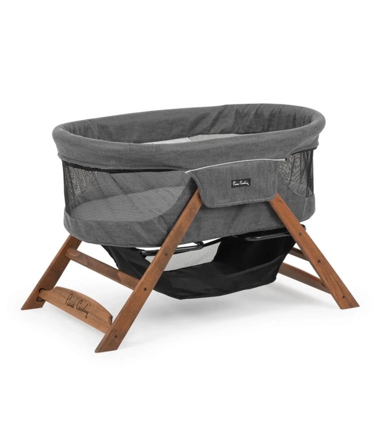Ahşap ayaklı, nefes alabilen file yanlara sahip gri bebek beşiği, konfor ve sağlamlık sağlar. ️
