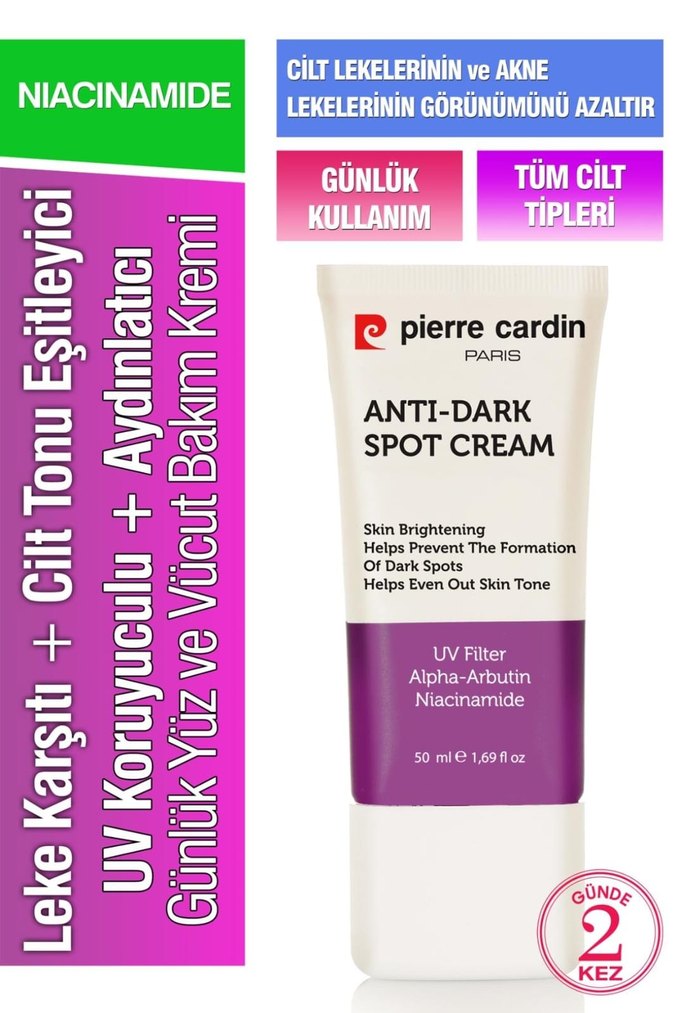 Pierre Cardin Anti-Dark Spot BB Krem, niacinamide ve alpha-arbutin ile cilt tonunu eşitler, lekeleri azaltır ve UV koruması sağlar. Tüm cilt tipleri için günlük kullanıma uygundur.