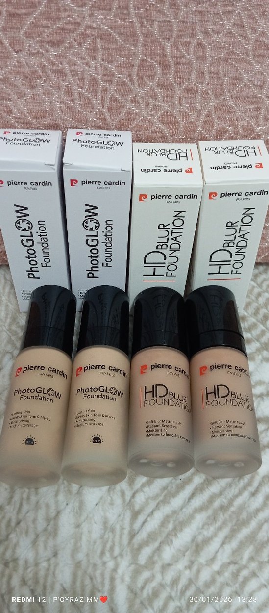 Pierre Cardin markalı, açık bej tonlarında PhotoGLOW ve HD Blur fondötenler. Doğal kapatıcılık ve pürüzsüz bitiş sağlar.