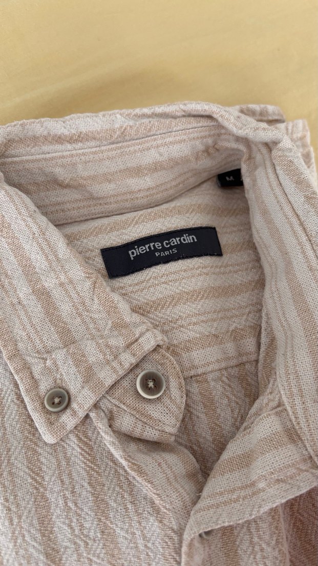 Pierre Cardin markalı, bej renkte, nakışlı keten erkek gömlek. Uzun kollu, düğmeli, yaka detaylı ve rahat kesimlidir. Günlük rahat sokak stili için uygundur.