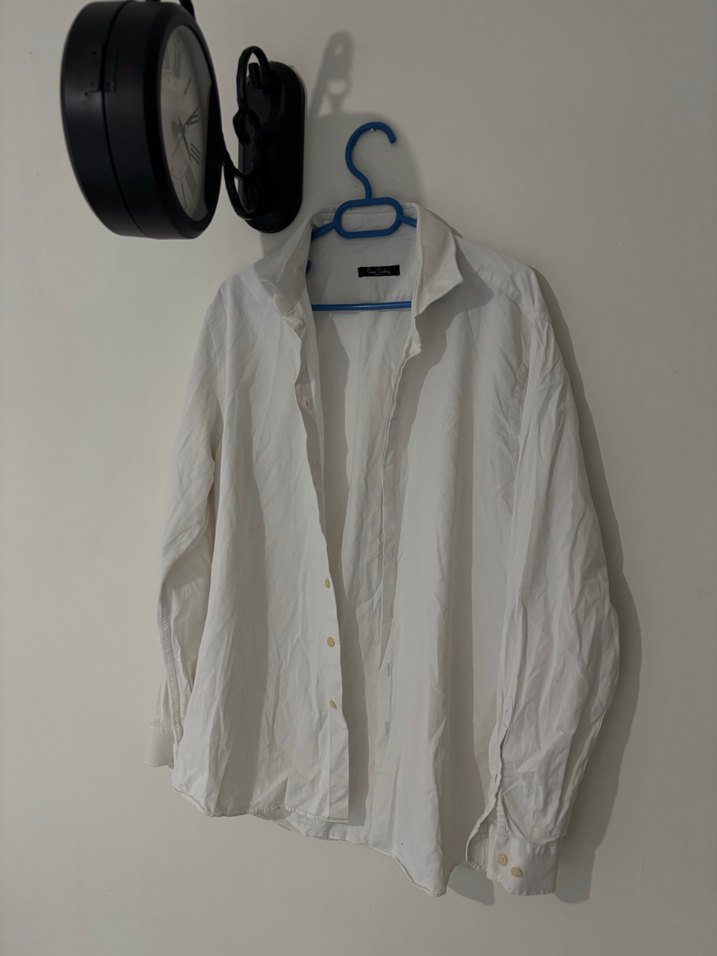 Beyaz renkli keten erkek gömlek, düğmeli, uzun kollu ve bol kesimdir. Temiz ürün