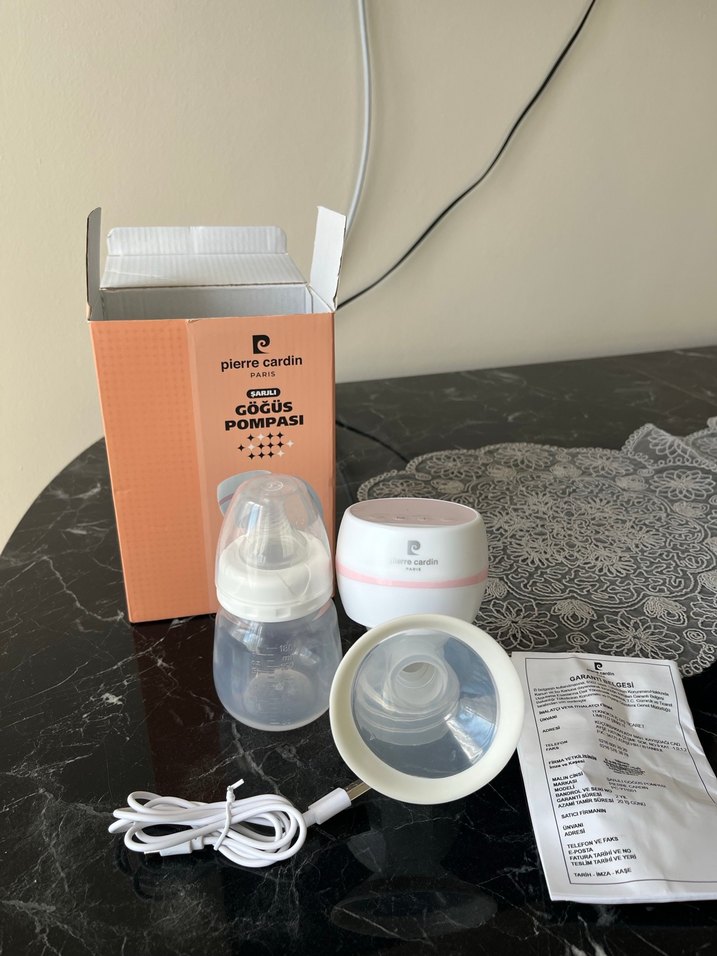 Pierre Cardin beyaz göğüs pompası, şişe, USB şarj kablosu ve çıkarılabilir parçalar içerir. Kompakt ve hafif tasarım.