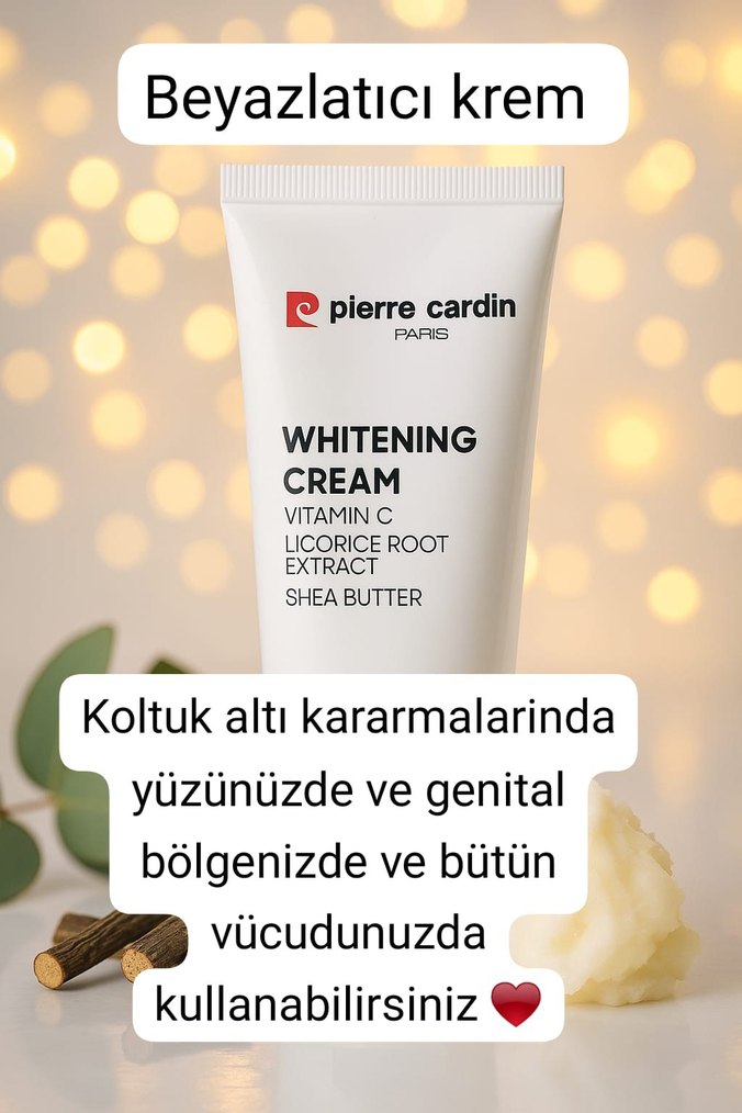 Pierre Cardin beyazlatıcı krem, vitamin C, meyan kökü özü ve shea butter ile koltuk altı, yüz ve genital bölge dahil vücudunuzdaki kararmaları azaltır.