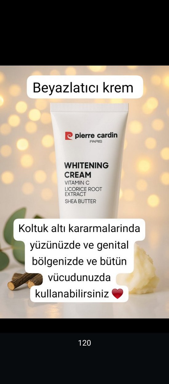 Pierre Cardin beyazlatıcı krem, vitamin C, meyan kökü özü ve shea yağı içerir. Koltuk altı, yüz, genital bölge ve tüm vücutta kullanılabilir.