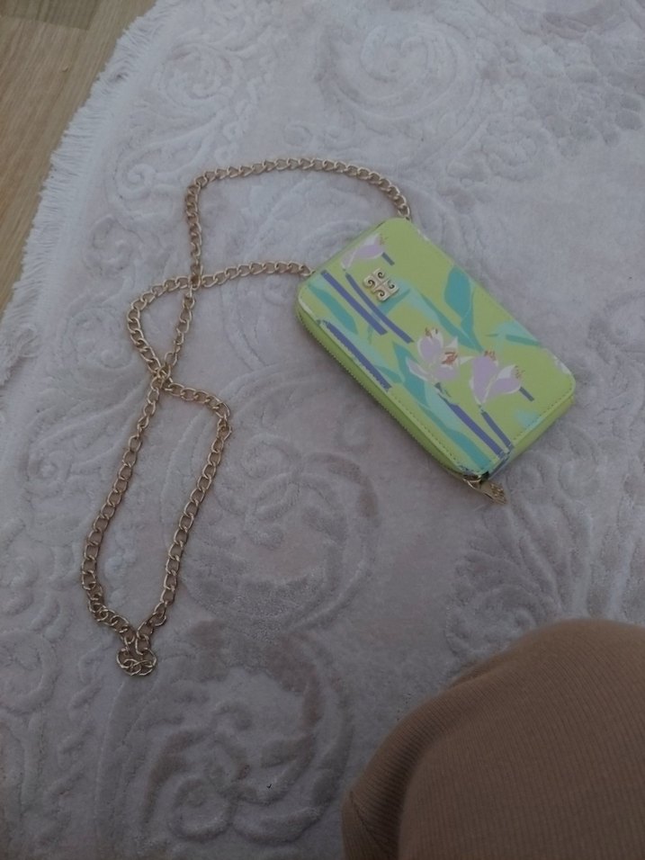 Çiçek desenli pastel renkli çocuk cüzdanı, altın renk zincir detaylı, bohem ve retro tarzlara uygun.sırunu yok sıfır ayarında bir kaç kez kullanıldı