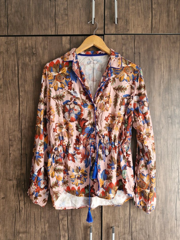 Bol kesim, uzun kollu, düğmeli ve yakalı bohem gömlek. Renkli çiçek desenleri ve püsküllü büzgü ipi bulunur. Yumuşak dokulu kumaştan yapılmıştır.