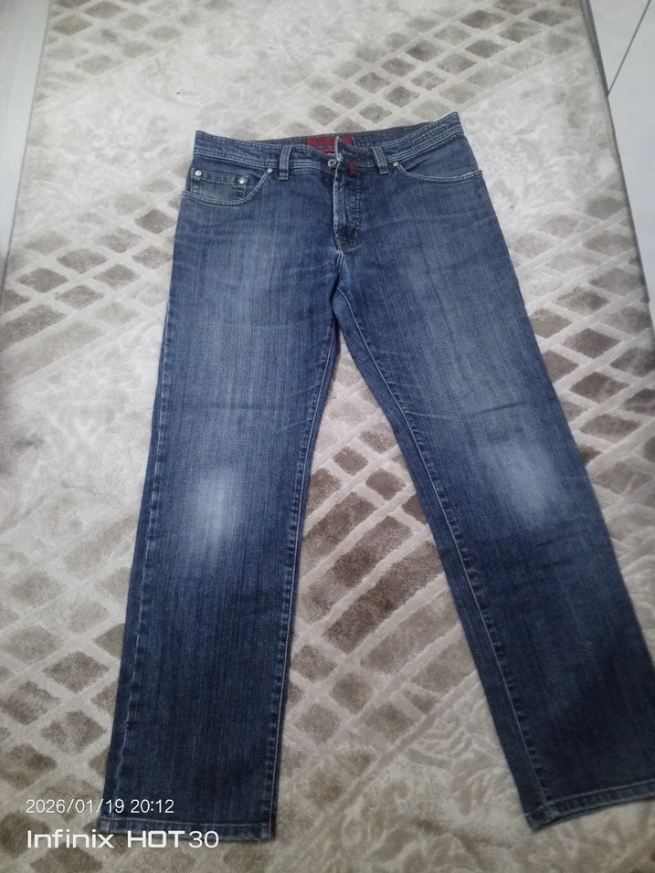 Pierre Cardin Deauville erkek jean, bordo ve gri renklerde, beden W34/L30. Sokak stili detaylarıyla dikkat çeker.