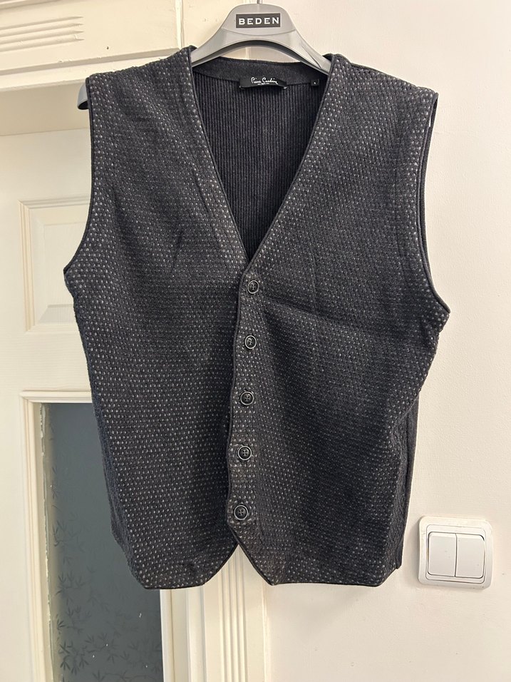 Pierre Cardin düğmeli ve yakası kesimli, gri renkli erkek yeleği. Rahat kesimi ve sade tasarımıyla günlük sokak stiline uygundur.