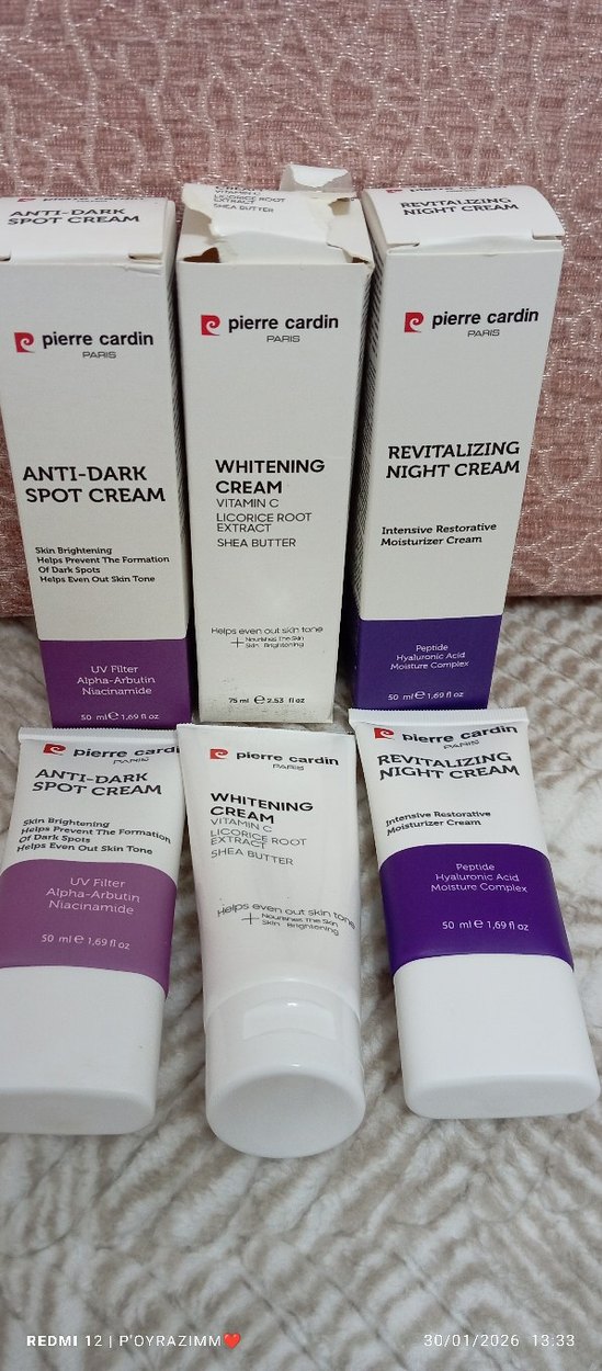 Pierre Cardin el kremi seti; leke karşıtı, C vitamini ve shea yağı içeren beyazlatıcı, hyaluronik asitli gece kremi içerir.