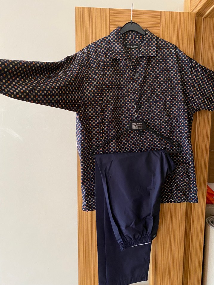 Erkekler için lacivert pijama takımı, uzun kollu ve düğmeli, yakası açık, desenli üst ve düz pantolon içerir. Rahat kesim ve midi boy uzunluğundadır.M yazsa da xl kalıbındadır.