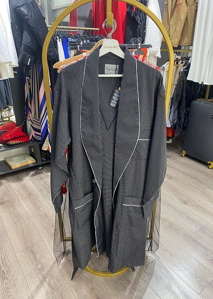 Yeni etiketli. Orijinaldir. Beden L. Marka Pierre Cardin. İki koltuk altı arası 66 cm. Omuzdan itibaren röpteşambır boyu 105 cm.