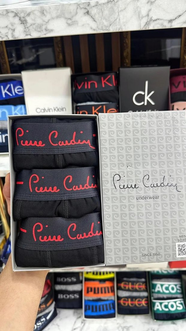 Kırmızı baskılı Pier Cardin logosu ile siyah, kısa boy, dar kesim erkek boxer seti. Parisli tarzını yansıtan 3 lü kutulu ürün.
