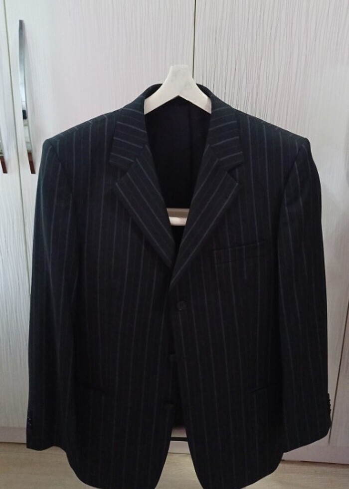 Lacivert çzigili takım elbise. 52 beden. 1 kere giyildi pantalona pens atıldı. Hiç bir sorunu yoktur. Omuzdan omuza 50cm Ceket boy 80cm Pantalon boy 107 cm