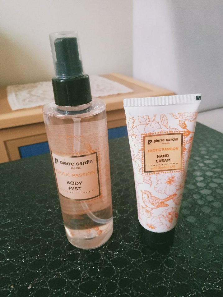 Pierre Cardin Exotic Passion vücut spreyi ve el kremi seti. Sprey hafif bir koku sunar, el kremi ise nemlendirir ve hoş bir koku bırakır.