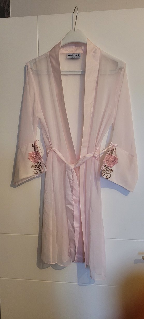 Pastel pembe renkli, bol kesim uzun sabahlık ve gecelik Kolları ince askılı ve manşetlerinde zarif nakışlı çiçek detayları bulunur, Paris bohem tarzını yansıtır. Hiç kullanılmadı dolap bekliyor etiketi yada kutusu yok düzgün paketleyip gönderilecektir.