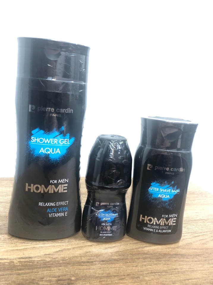 Pierre Cardin Homme Aqua erkek vücut bakım seti; duş jeli(300 ml), deodorant rollon (50 ml)ve tıraş sonrası balsam (150 ml)içerir. Aloe vera ve E vitamini ile rahatlatıcı etki sağlar. Jelatinli hiç açılmadı