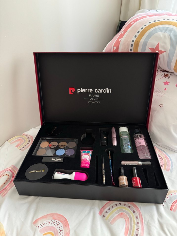 Pierre Cardin marka, içinde göz farı, ruj ve fırçalar bulunan makyaj seti. Şık siyah kutuda sunulmuştur.