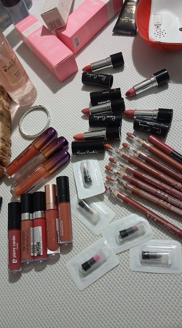 Çeşitli açık kahverengi tonlarında Pierre Cardin ruj ve dudak kalemleri seti. Hem klasik hem sıvı rujlar içerir. glost veya ruj çeşitlerinden ürün alanlara mini rujlardan istediği renk hediye