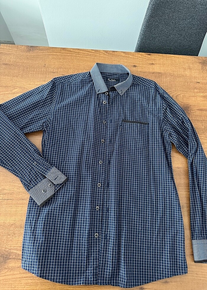 #pierrecardin marka orjinal lacivert küçük kareli gömlek. Cep kenasında kahve süet deyatı var. 2 kere giyildi hiçbir sorunu yok yeniden farksız. Boy 70 cm iki koltuk arası 50 cm m bedendir. Yüzde yüz pamuktur.