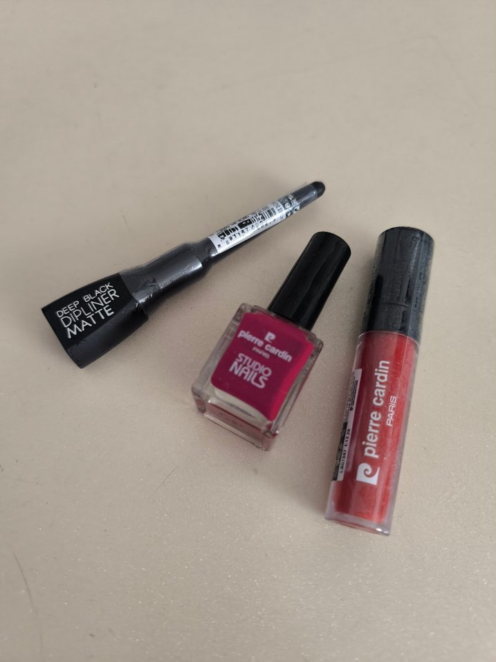 Pierre Cardin koyu kırmızı mat dudak parlatıcısı, uyumlu oje ve eyeliner ile birlikte.