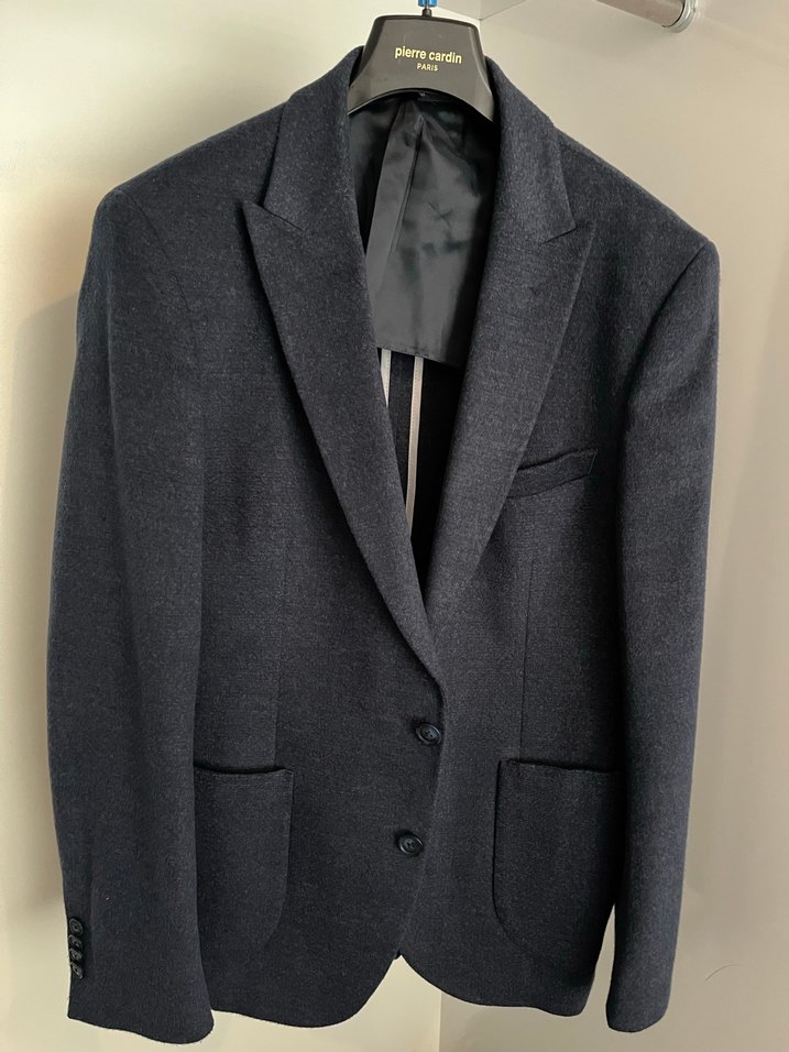 Pierre Cardin markalı, griye çalan lacivert renkte, düğmeli ve slim fit erkek tek ceket. Kırlangıç yaka ve ofis kullanımı/günlük kullanım için uygundur.