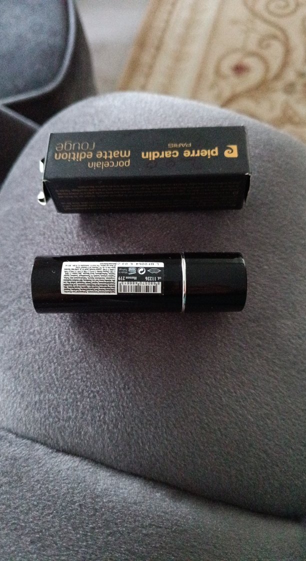 Pierre Cardin mat siyah renkte ruj, şık ambalajda. Dudaklara koyu ve canlı renk sağlar.