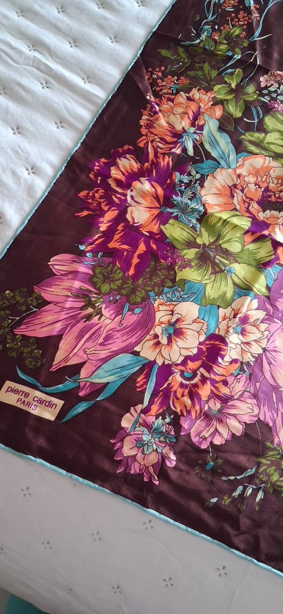 Pierre Cardin marka, canlı çiçek desenli, mor renkte, ipek dokulu ve drapeli şal. Bohem, Parisli ve karşı kültür tarzını yansıtır.ipek esarp