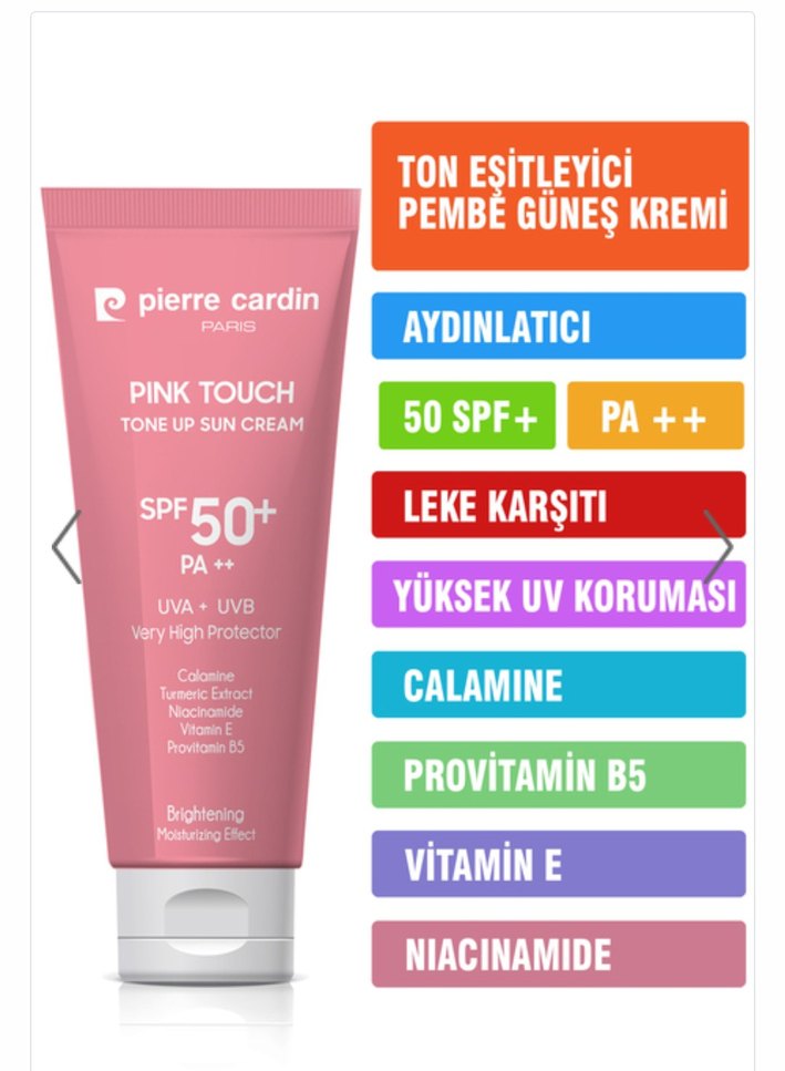 Pierre Cardin Pembe Ton Eşitleyici Güneş Kremi SPF50+, yüksek UV koruması sağlar. Aydınlatıcı ve leke karşıtı etkisi ile cilt tonunu eşitler, calamine, niacinamide, provitamin B5 ve vitamin E içerir.