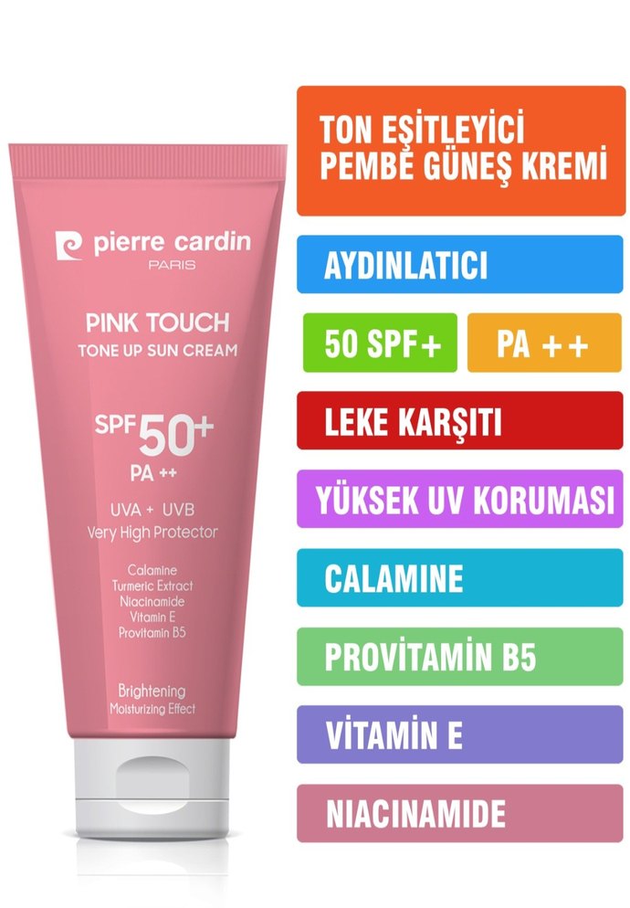 Pierre Cardin Pembe Ton Eşitleyici Güneş Kremi SPF50+ yüksek UV koruması sağlar. Calamine, niacinamide, vitamin E ve provitamin B5 ile cildi aydınlatır ve leke karşıtı etki sunar.