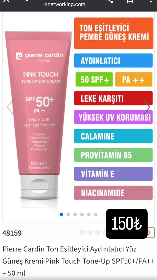 Pierre Cardin Pembe Ton Eşitleyici Güneş Kremi, SPF 50+ ve PA++ ile yüksek UV koruması sağlar. Calamine, niacinamide, provitamin B5 ve vitamin E içerir, cilt tonunu aydınlatır ve korur.