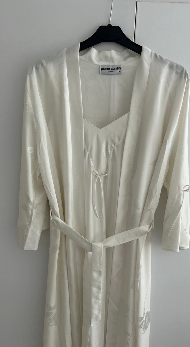 Pierre Cardin markalı, uzun boylu, ince askılı, modern klasik tarzda, bol kesim beyaz saten kadın sabahlık. Minimalist tasarıma sahip. ✨ herhangi bir kusuru yoktur.
