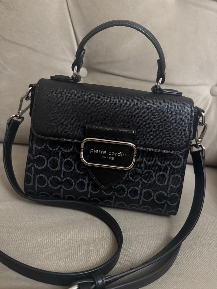 Pierre Cardin logosu baskılı siyah deri çanta, tokalı kapak ve hem elde hem omuzda taşınabilir askıya sahip. Sokak stili için uygun.