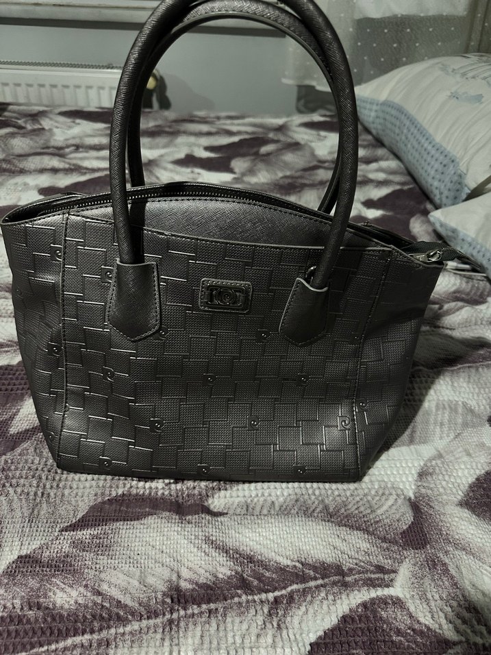 Siyah deri, tokalı, dokulu desene sahip kadın çantası, günlük kullanım için uygun, sağlam saplı.