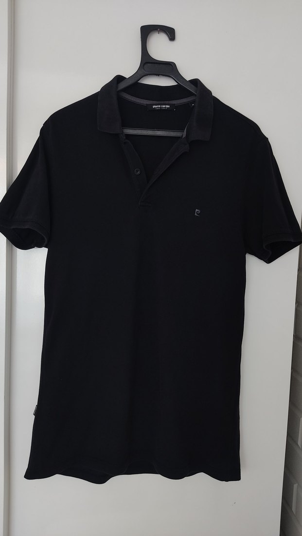 Siyah, polo yaka ve kısa kollu, vücuda oturan erkek tişörtü. Pürüzsüz sentetik kumaştan, desen içermeyen sade tasarım. Günlük ve sokak stiline uygun. m beden Pierre Cardin erkek tişört