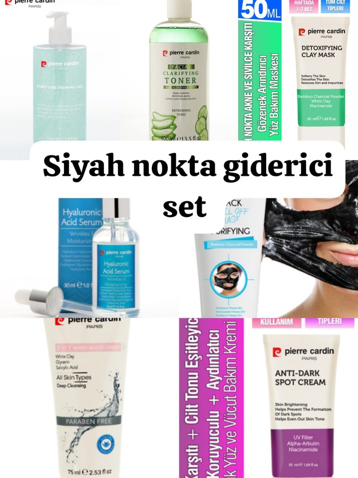 Pierre Cardin siyah nokta giderici set, detoks kil maskesi, tonik, leke kremi ve hyaluronik asit serumu içerir, cildi temizler ve aydınlatır.
