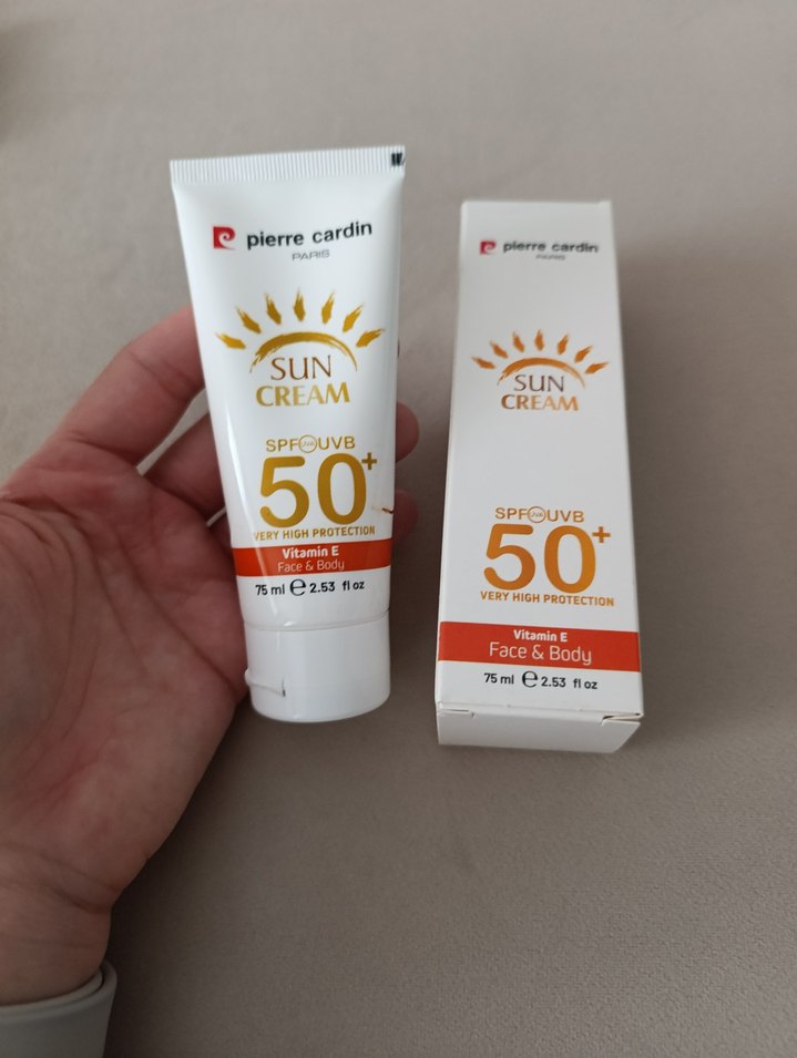 Pierre Cardin güneş kremi, yüz ve vücut için SPF 50+ koruma sağlar ve E vitamini içerir. 75 ml tüpte sunulur. ☀️
