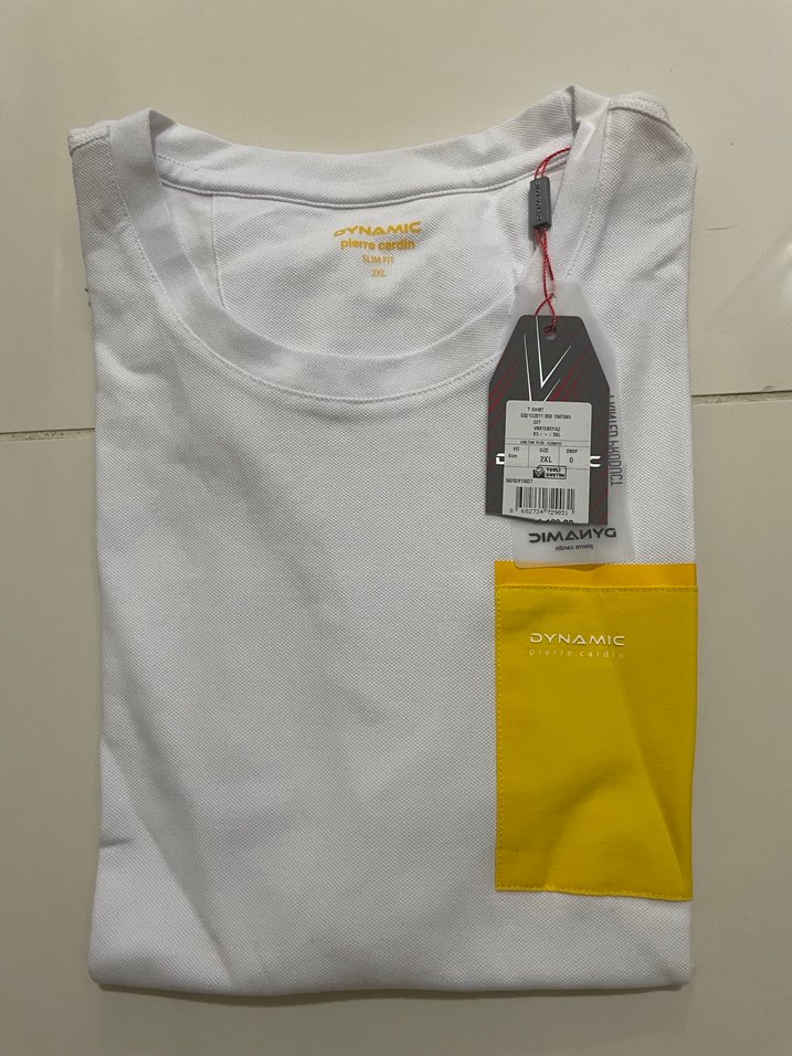 Dynamic markalı beyaz erkek tişört, sarı cep detayı ve slim fit ile günlük rahat kullanım için üretilmiştir.