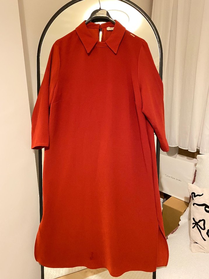 Koyu kırmızı renkte, yakalı ve uzun kollu midi tunik. Yumuşak ve sıcak kumaştan, bol kesim ve drapeli tarzda, ofis veya sokak giyimine uygun.