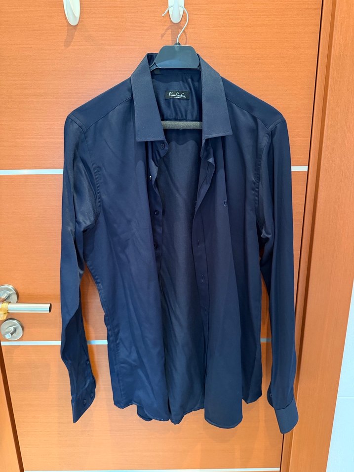 Pierre Cardin XL Erkek Lacivert Gömlek; hiç giyilmemiş, tertemiz, sanırım Slim fit, pırıl pırıl ve yumuşacık dokusuyla çok güzel bir lacivert. İki koltuk altı arası 55 cm, boy 71 cm. Yedek düğmesi de içinde.