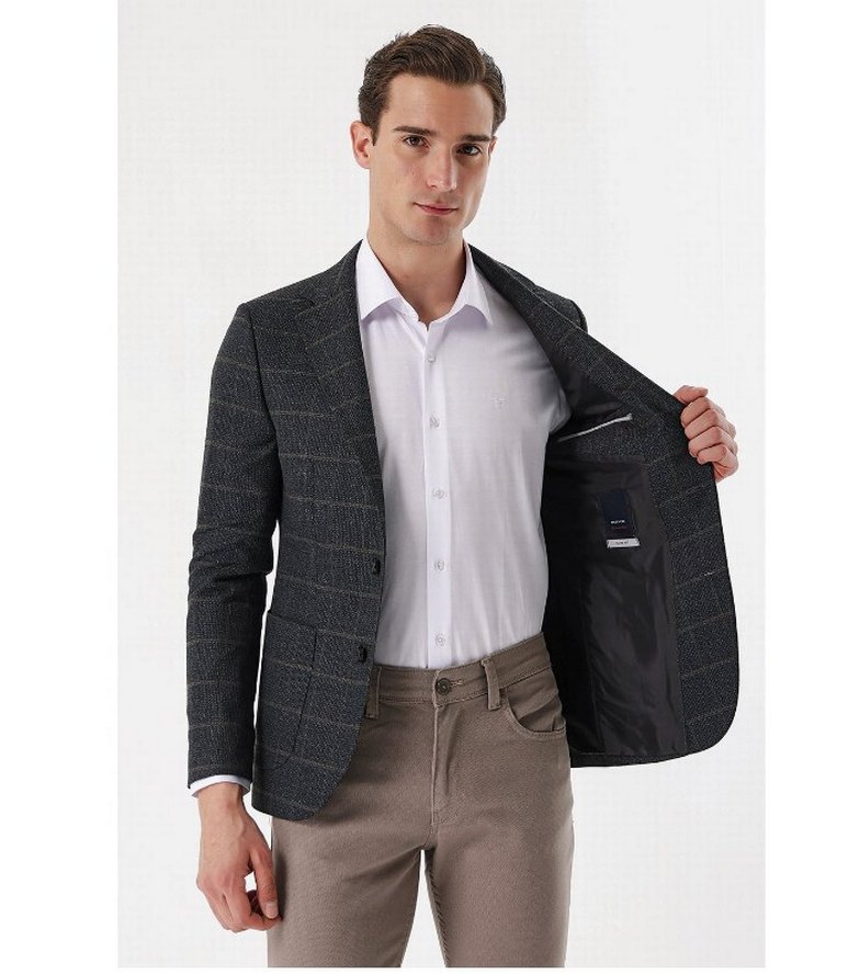 Erkek ceketi, düğmeli ve kesik yakalıdır. Gri renkli, pürüzsüz sentetik kumaştan yapılmıştır. Normal boyda, uzun kollu ve rahat kesimdir.