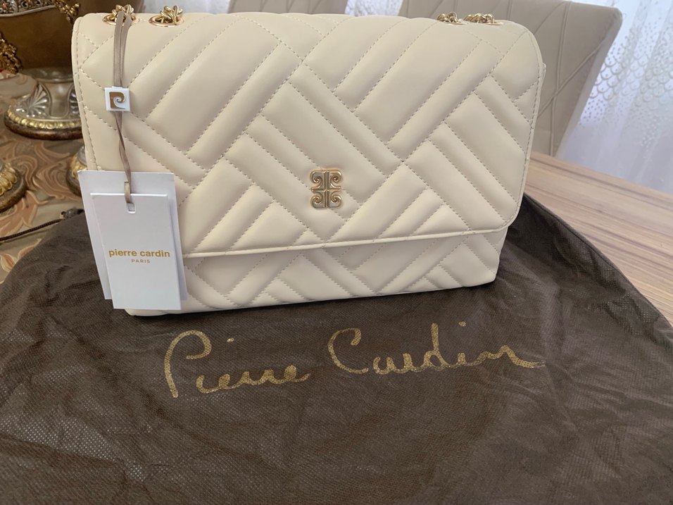 bej deri çanta, zincir detayları ve kapitone desenleriyle modern klasik tarzı Paris şıklığıyla birleştirir. Kullanılmadı, sadece kumaş çantanın içine, bagaj dolabına konuldu.