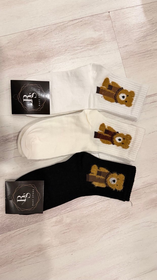 Nakışlı kahverengi ayı desenine sahip kız çorapları, yumuşak ve sıcak tutan kumaştan üretilmiştir. Beyaz, krem ve siyah renk seçenekleri mevcuttur.