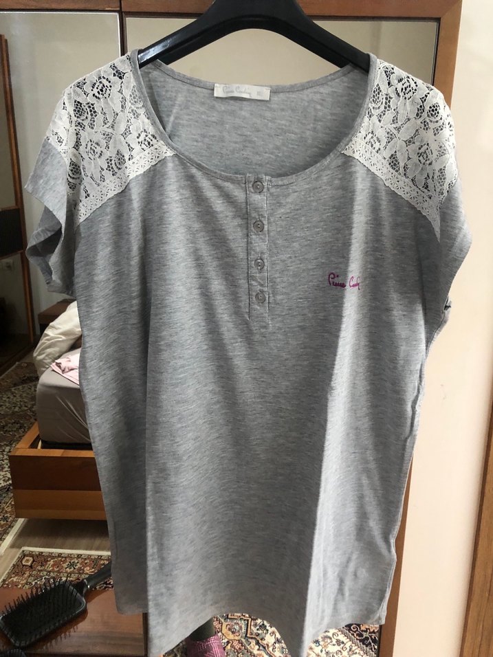 Dantel detaylı omuzlarıyla gri hamile tişörtü. Pamuklu, kısa kollu, bol kesim ve yuvarlak yakalı, günlük rahat kullanım için uygun.çok temiz hiç tülerme yok